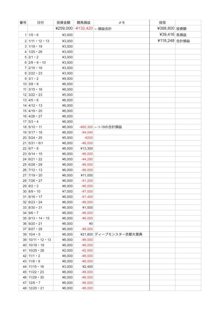 第48回を終えて競馬の損益はー132,420円、投信の損益は+118,248円でした。