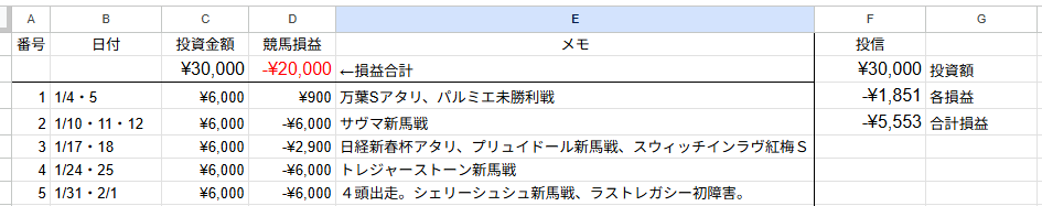 惜しいレースもありましたが全てハズレましたので、競馬は-6,000円ですね。