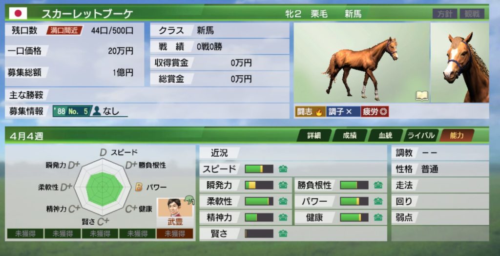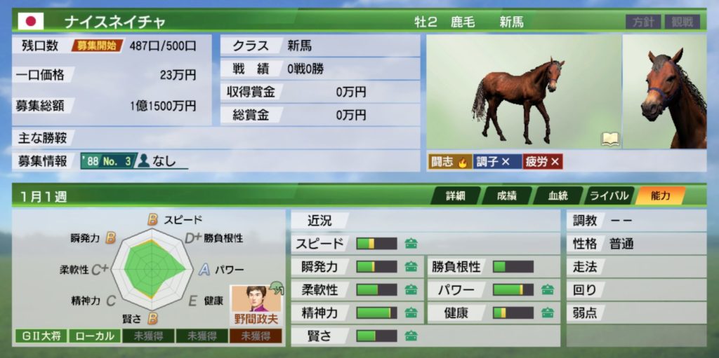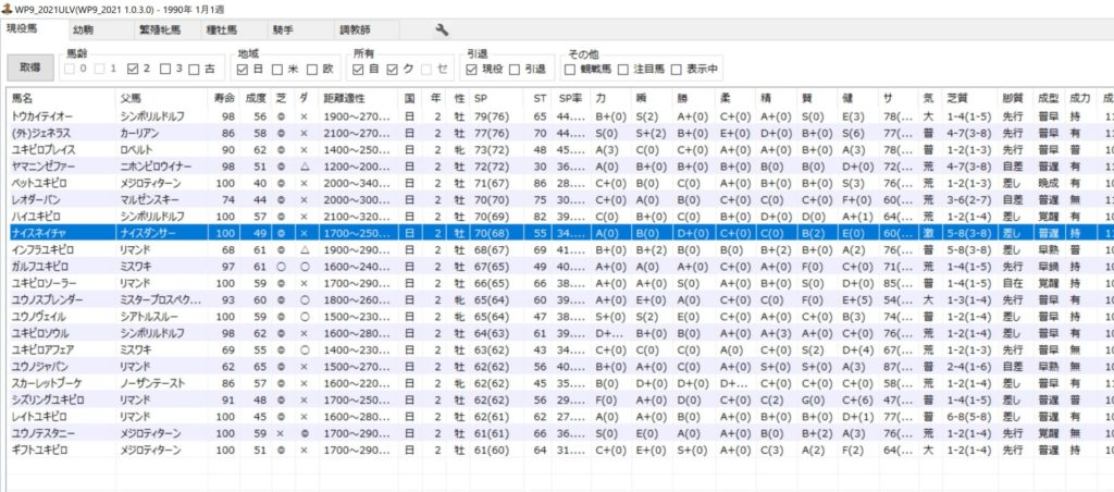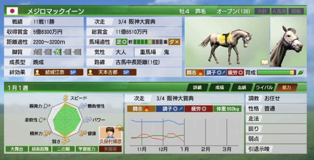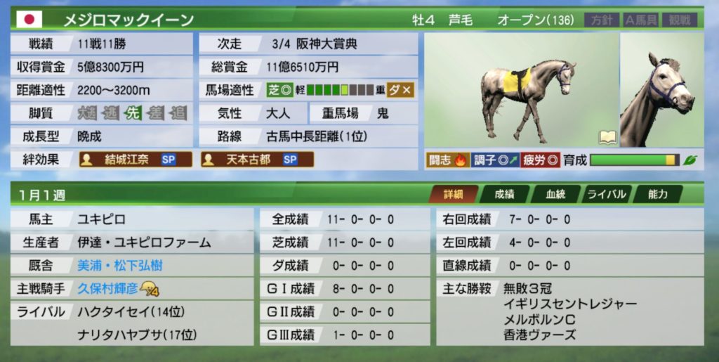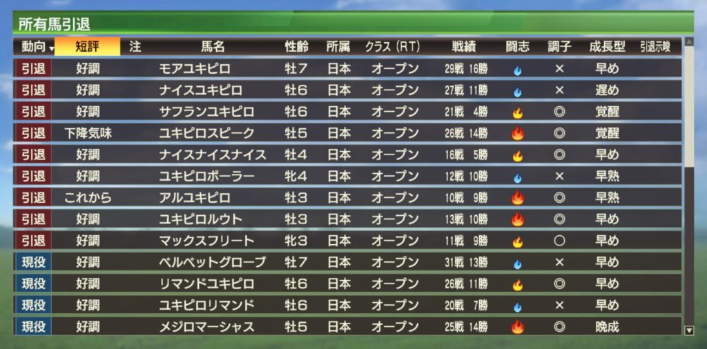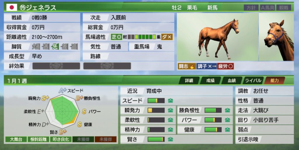 また、ウイポ8ではどうしても晩成馬は早めから使い難い印象でしたが、ウイポ9は絆コマンドがあるおかげか早期から活躍しやすい印象です。